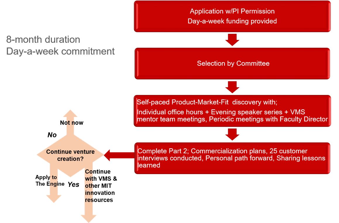 You should expect to spend your time in self-paced product-market-fit discovery augmented by individual instructor/mentor office hours, evening speaker series, VMS mentor team meetings, and periodic meetings with Marc Baldo, TFP Faculty Director and RLE Director.